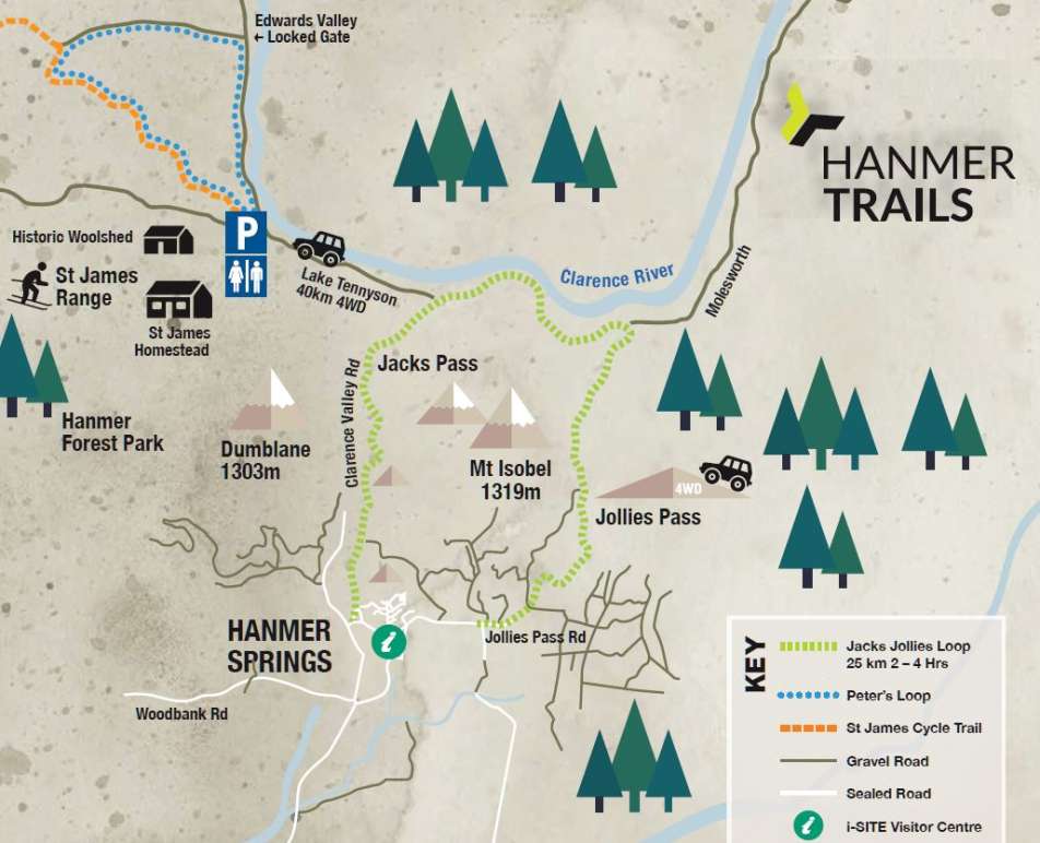 Hanmer Springs is now synonymous with fantastic single-track mountain bike riding. the tracks accommodate the novice rider through the Heritage Forest, as well as more advanced riding north of Jollies Pass Road. For the more adventurous, there are backcountry roads and trails in the St James Conservation Area and the infamous Jacks Jollies Loop.